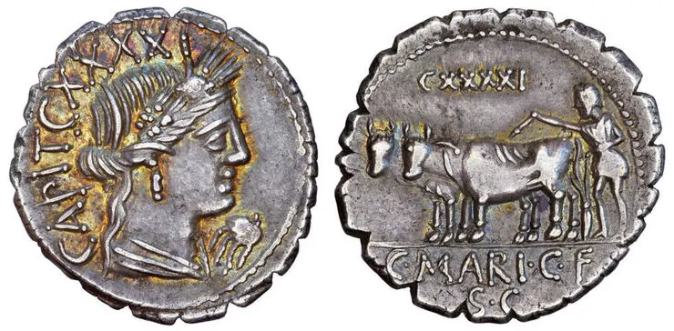 I am very pleased to add to my collection this equally historical and handsome Roman Republican denarius serratus, minted by the moneyer Gaius Marius Capito in 81 BC. This moneyer, unrelated to the famous Gaius Marius, is known only from his coins struck during the dictatorship of Sulla - in the tense aftermath of his defeat of the Marians, second march on Rome and bloody proscriptions. The Damoclean sense of terror that prevailed in Rome after Sulla’s total victory is chillingly described by Pl